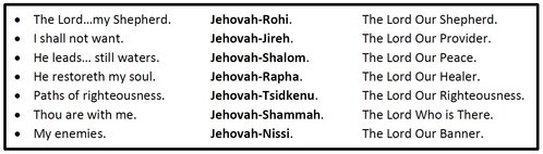 Also, take notice of this most important feature of Psalm 23. The Lord is my Shepherd. It is all about Jesus! This Psalm talks about HIM! It is all JESUS! We see Him. The Lord! Look at the all the names of God we can see in this Psalm. Is it coincidental? I think not. Go through the Psalm again with your Bible in your hand and see the Lord in this!